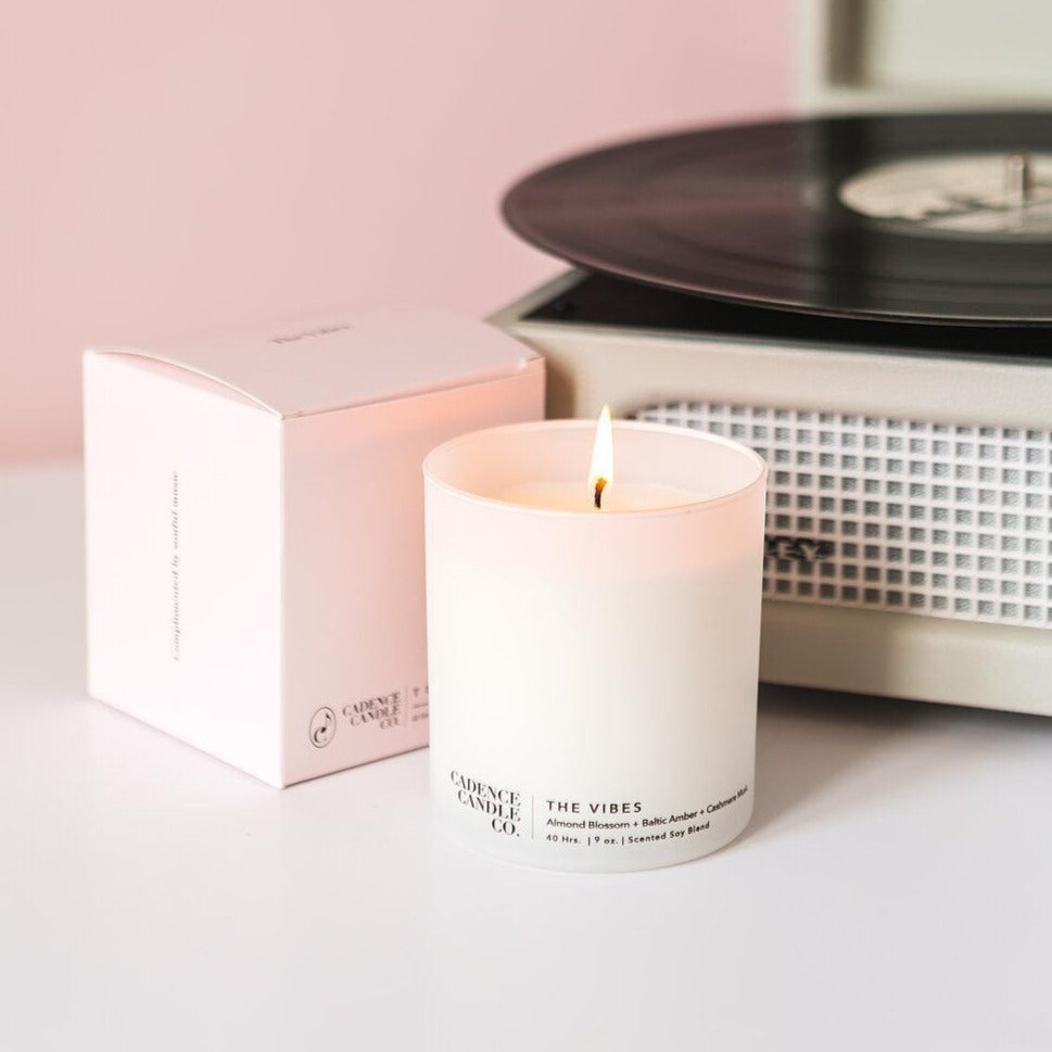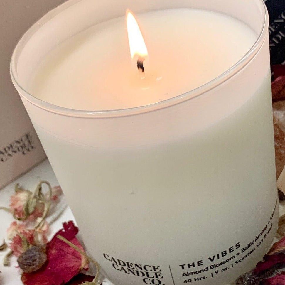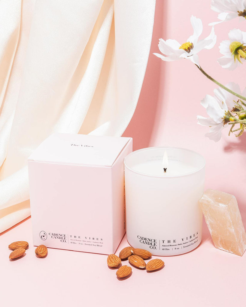 This warm, floral scent radiates fragrant notes of warm amber, almond blossom, and cashmere musk. "The Vibes" brings you 9 ounces of blossoming, passionate aroma. This candle's peeking base note of musk draws the floral scents warmer, and deeper. This is more than a surface-level candle, it's a V I B E .